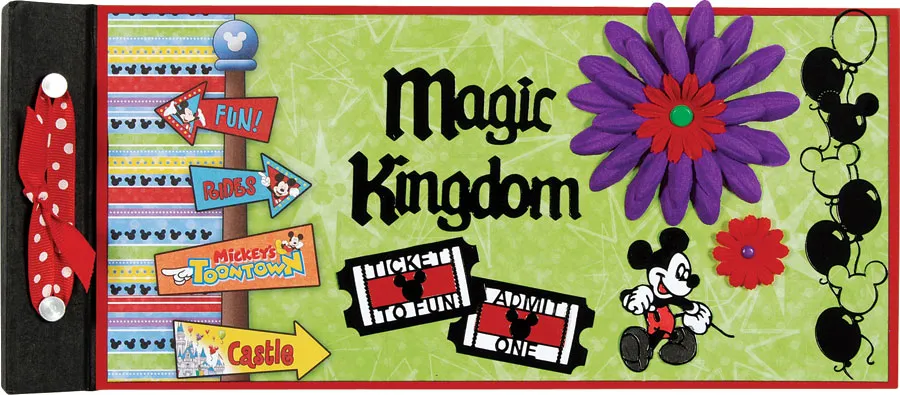 Remove album posts and interior pages. Paint the album spine black and let it dry. Cover the front cover with red cardstock. Ink the edges of an 11 1/4”x5 3/8” rectangle of green border paper. Adhere the Mickey Dazzles™ balloon border to the right side of the border paper. Glue the remaining green border paper to the back cover.