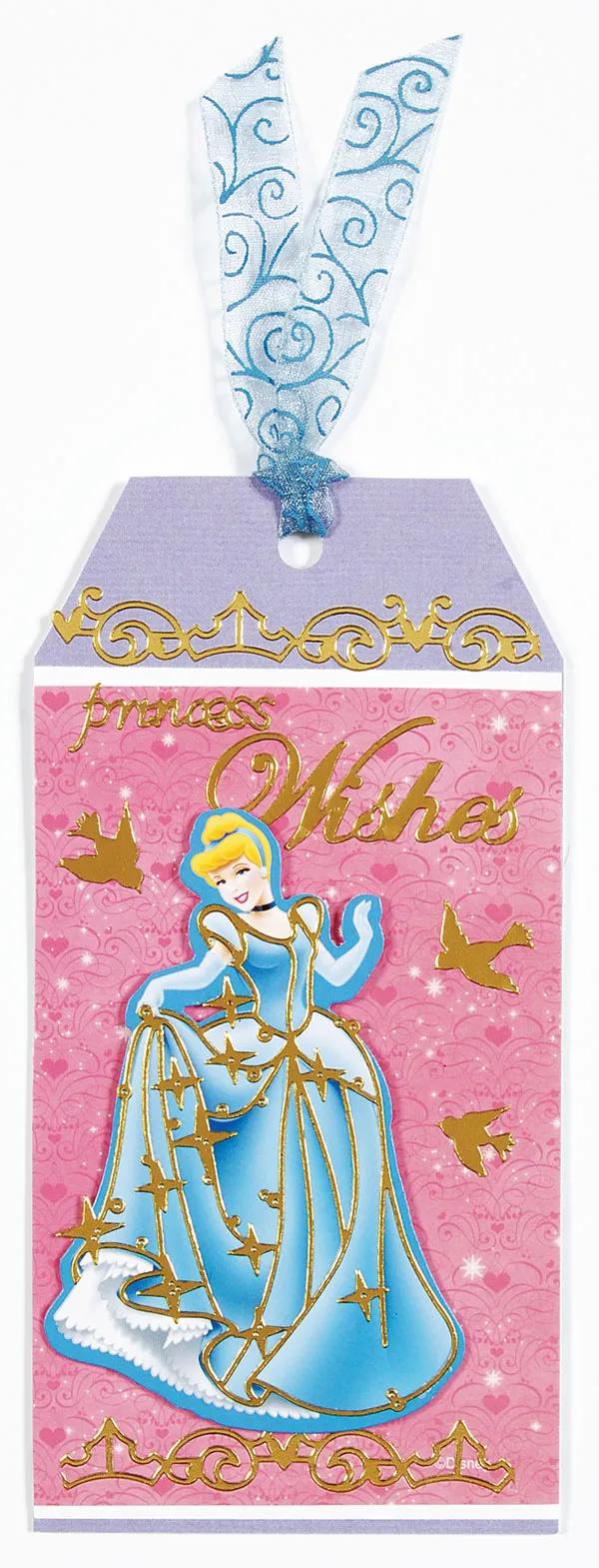 Place a length of the Dazzles? border across the tag above the pink paper and across the bottom of the pink paper. Place the words “Princess Dreams” at the top of the pink paper. Apply the Dazzles? dress to the Cinderella die cut and foam tape to the center of the tag. Place birds around the Princess.