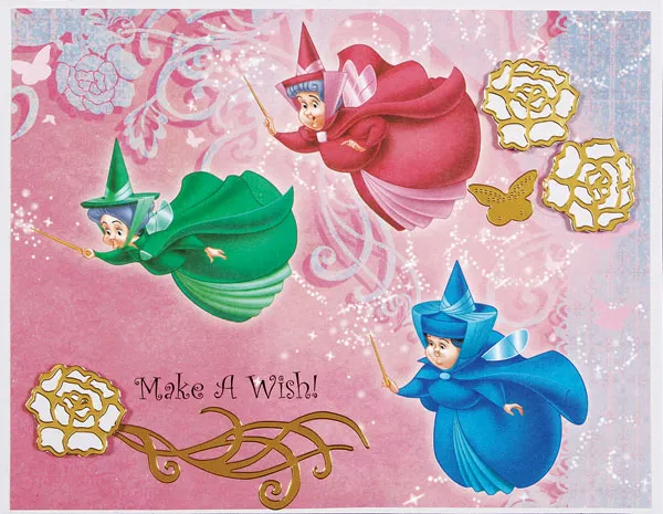 This card was really fast to make. Place the card fold at the top. Cover the card with lavender cardstock. Cut the top right corner of the paper with fairies into a 6 ¼”x5 ¾” rectangle. Print “Make a wish!” at the bottom left corner and glue to the center of the card.