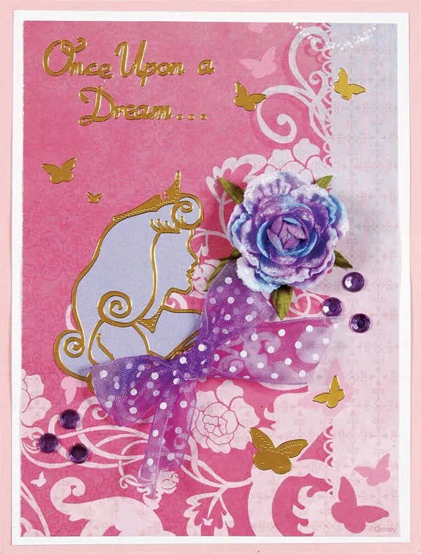 Place a Sleeping Beauty silhouette Dazzles™ onto lavender cardstock and cut out. Glue to the left of the border. Glue a purple/blue flower to the right and a purple dot bow below the Dazzles?.