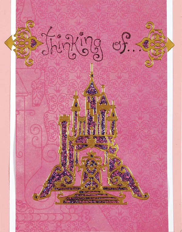 Place the Sleeping Beauty castle Dazzles™ on the card front. Stamp “Thinking of..” above the castle. Adhere Dazzles? corner stickers, on their sides, to the right and left. Embellish the castle and corners with Grape Stickles and let dry.