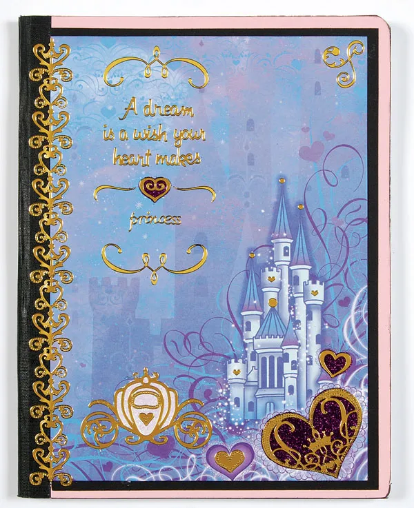 Adhere a Dazzles? border over the seam between the castle paper and black binding of the book. Place the words “A dream is a wish your heart makes” and “Princess” surrounded by swirls.