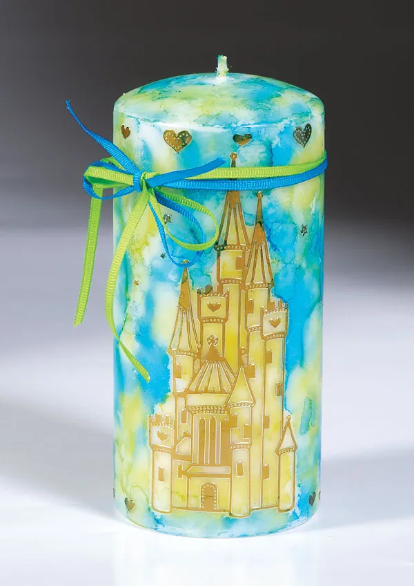 Apply blending solution and citrus ink to the applicator pad. Apply over the castle sticker. Don’t worry about getting ink on the Dazzles? sticker. Without changing applicator pads, apply sailboat to the pad, along with more blending solution if necessary. Apply the blue around the outside edges of the castle and over the candle surface. Let dry and wrap ribbons around the top of the candle.