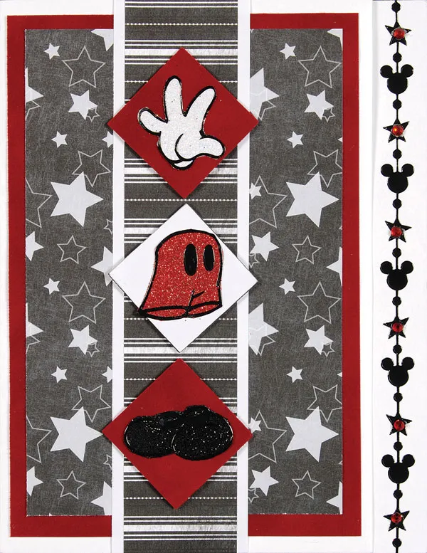 Inside the card: Place the Mickey border Dazzles™ down the right edge of the card. Mat a 2 ½”x1 ½” rectangle of red suede with black cardstock, leaving a 1/8” border. Glue over a 4”x1” strip of striped paper and secure white brads at each end of the suede. Glue to the top of the card. Glue a glittered white glove to the top right corner.