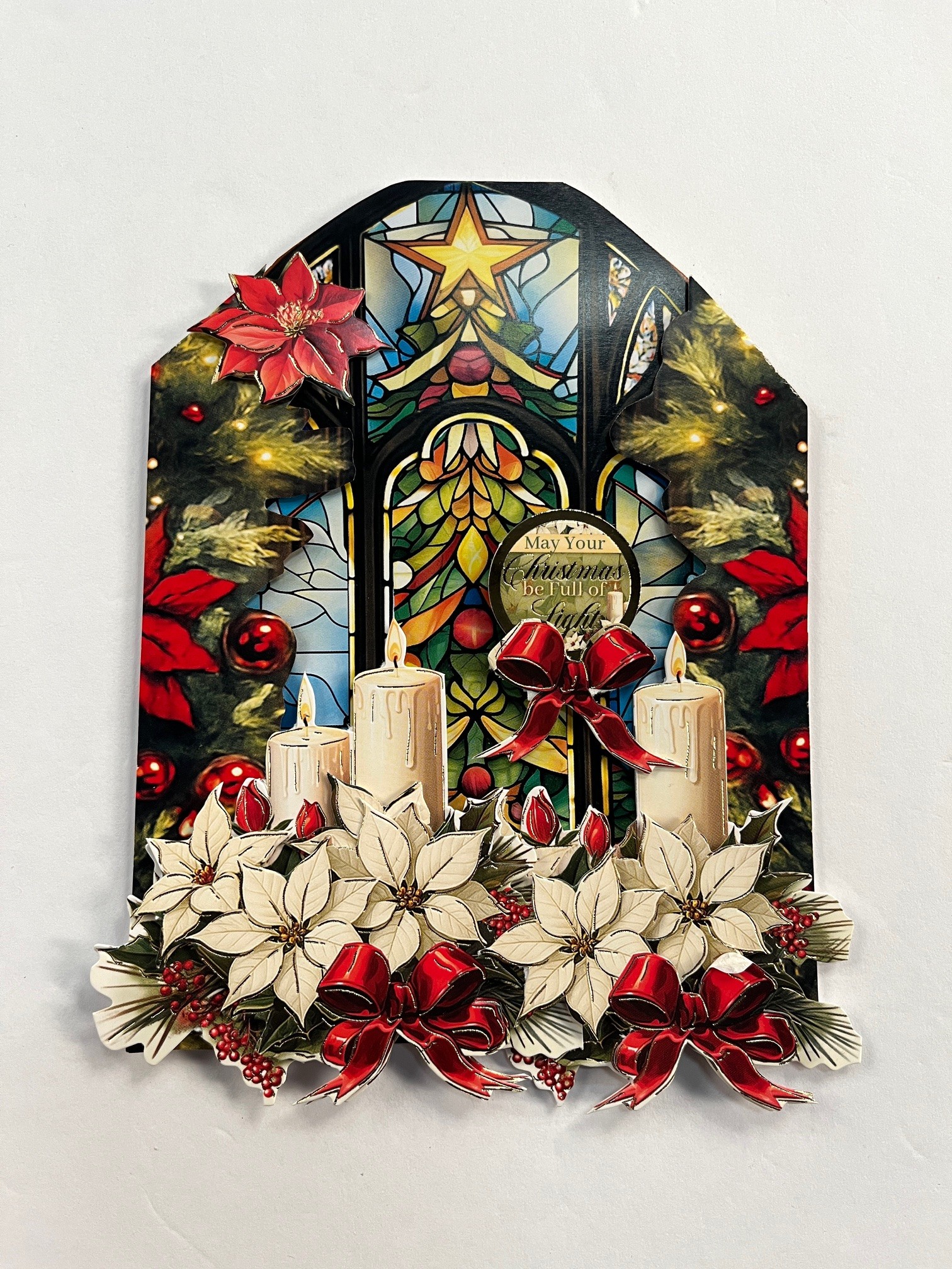 Foam tape the two large candles with poinsettia at the bottom. Foam tape the other pieces over the matching art to fill the card. Foam tape “May Your Christmas be full of Light” Topper center right as shown.