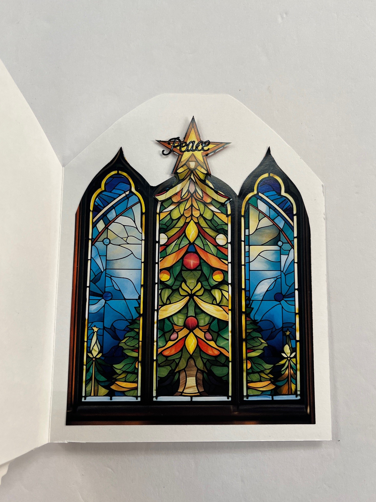 Card inside: Trim off the stained and tape to inside card in the center. Trim off the star from the tree top and foam tape as shown. Place “Peace” Dazzles™️ in the center.
