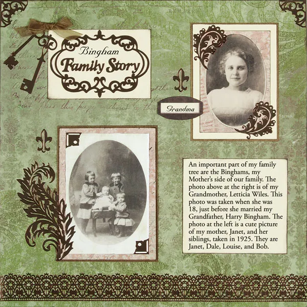 Add two key stickers to upper left corner overlapping the "Family Story" plaque. Zot a ribbon at the top of the keys. Add large corner stickers to the top of the page corners. Add paisley stickers to decorate the edges of one photo mat. Add larger leaf swirl to lower left edge of second photo. Add small corner stickers to the photo mat to opposite corners as shown. Add fleur de lis stickers.
