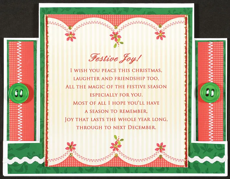 Cut 3/4” from the top and bottom borders on the Little Book of Festive Poetry “Festive Joy” greeting. Cut the 3/4” wide pieces to 3 1/2” long and glue to the center of each side step. Thread two green buttons with thin strips of white cardstock and Zot™ the ends to the button back. Zot™ the buttons to the center of the side steps. Foam tape the greeting to the center panel as shown. Place Dazzles™ as shown.