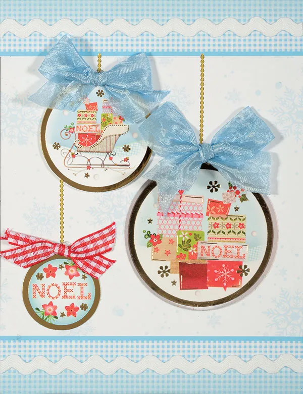 Use ¾” wide Picnic blue crepe ribbon to make 2 bows and Zot to the 2 top circles. Knot two lengths of ½” wide red/white gingham ribbon together and Zot to the top of the “Noel” circle.