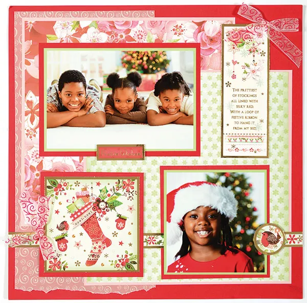 Photos: Mat a 6”x4” photo with lime green cardstock, leaving 1/8” borders and then with red cardstock, leaving ¼” borders. Glue to the page, 1¼” from the left and 1½” from the top. Foam tape the Stocking Surprise sheet “Festive Wishes” die-cut to the bottom photo edge. Glue 4½” square of red cardstock 1¼” from the right and 7/8” from the bottom of the page. Cut the die-cut border into 2” and 9” lengths. Glue across the page, 2 1/8” from the bottom, leaving a gap between ends. Mat 4” square photo with lime green cardstock, leaving 1/8” border and glue to the red cardstock square, covering the gap in the die-cut border. Foam tape the bird circle die-cut to the right edge of photo as shown.