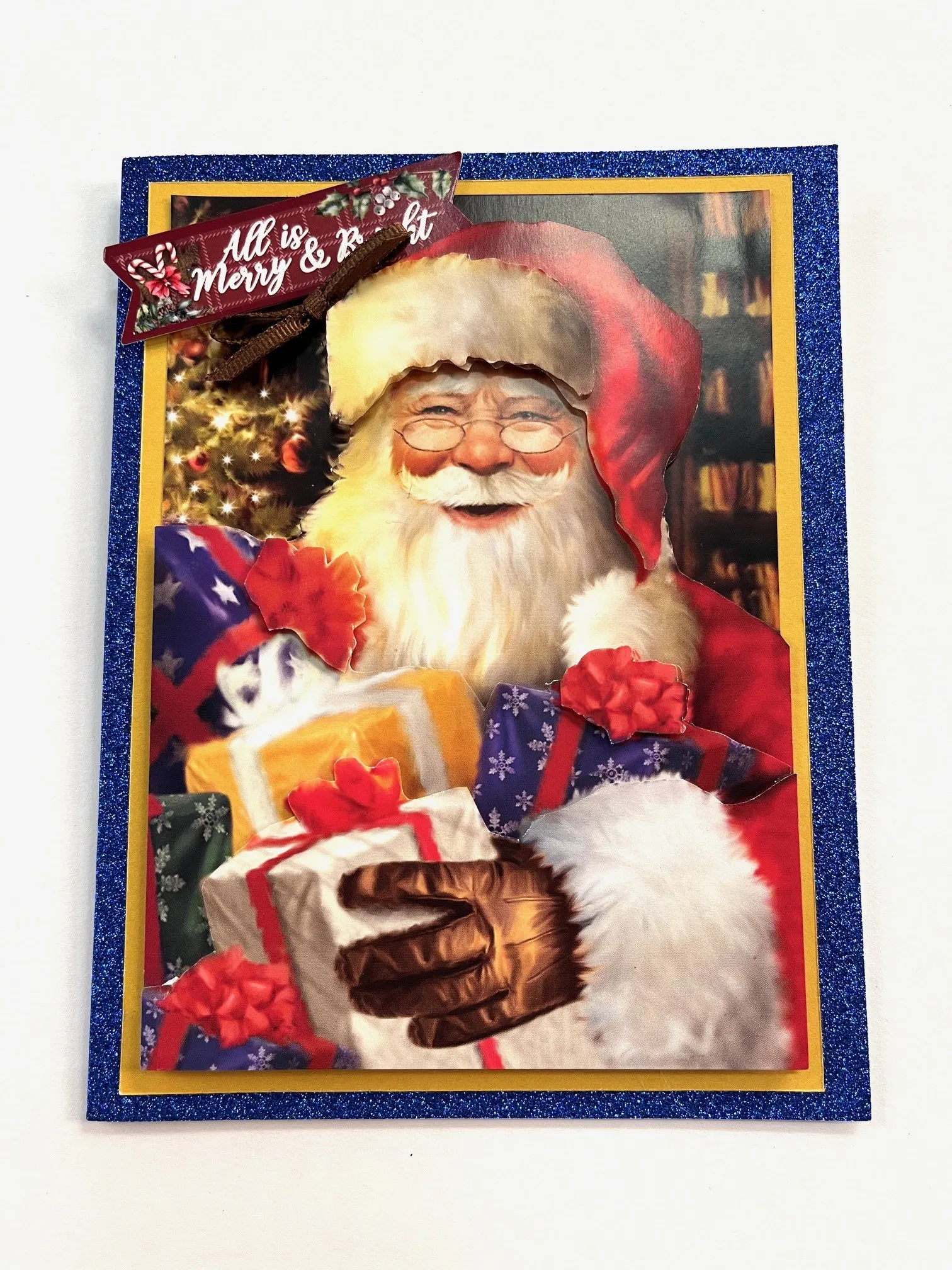 Cover the card front with blue glitter cardstock. Mat the Santa from the Little Book on yellow Christmas Aglow 12x12 solid cardstock with 1/8” borders. Tape to the card. Foam tape a full cutout of Santa over the original art. Cut and foam tape two more layers as shown. Foam tape “All is Merry and Bright” die-cut in the top left corner as shown. Make and Zot™️ a 1 1/2” wide brown bow below it.