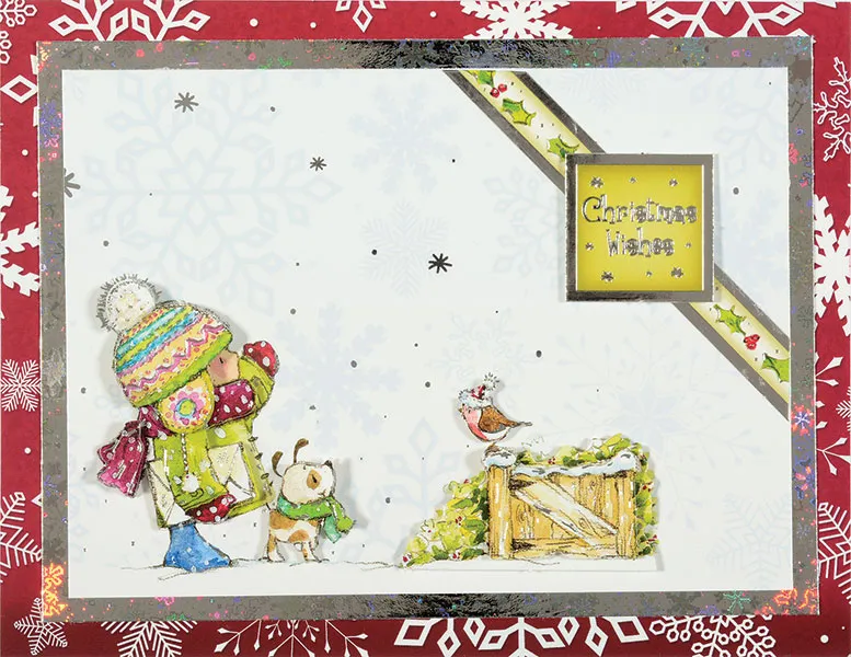 Card front: Place a blank card with the fold on top. Cover with maroon snowflake cardstock. Cut a 5½”x4” snowflake cardstock with the child and fence in the left corner. Mat on Snowflake Holographic paper with ¼” borders. Glue to the card front, centered. Glue a length of holly border across the right corner at an angle and trim the excess. Foam tape the “Christmas Wishes” sentiment to the center of the border.