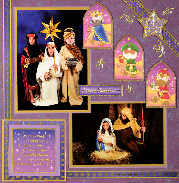 Mat your photos on gold metallic paper with 1/8” borders. Mat again on purple cardstock with 1/16” borders. Glue one on the bottom right corner ¾" from the right side, and 1” from the bottom. Glue the second one overlapping the first on the top left corner, ¾" from the left side and ½” from the top. Mat the “We Three Kings” sentiment from the page on purple cardstock with ¼” borders. Mat again on gold/purple star cardstock with 3/8” borders. Mat again on gold metallic paper with 1/16” borders. Glue to the bottom left corner 1/8” from the edges.