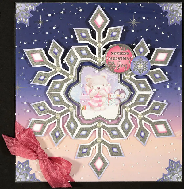 Card front: Pop out the large snowflake from the “My Winter Friend” sheet and pop out the bear from the center. Zot™ or tape the snowflake centered on your card front and foam tape the “Sending Christmas Joy!” and small blue snowflake die-cuts as shown. Place pearls on the large and small snowflakes.