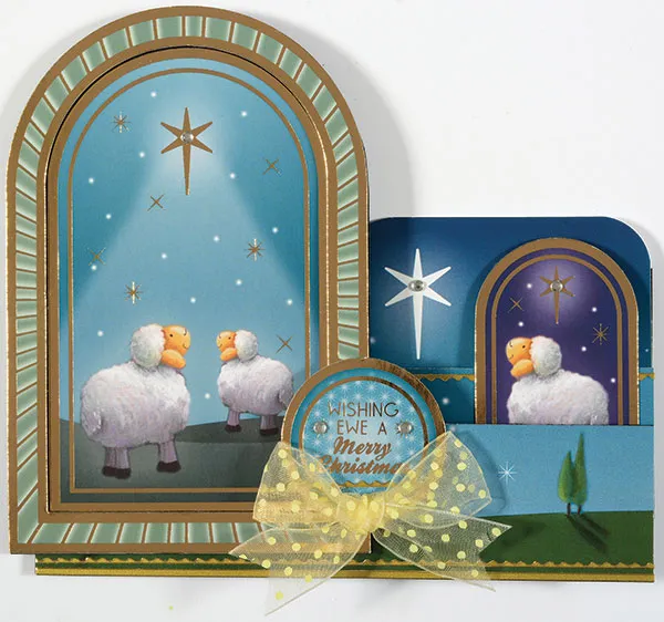 Glue the single sheep arched die-cut on the right side of the front riser and foam tape the “Wishing Ewe A Merry Christmas” label as shown. Zot™ on a bow of ivory dotted sheer ribbon and place baby bling on the stars as shown.