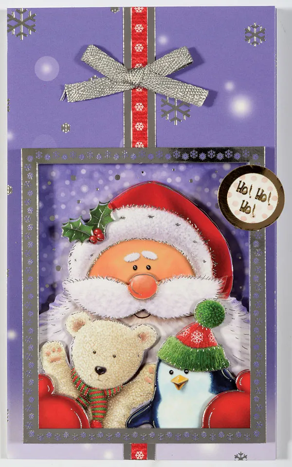 Center the die-cut border on the card front vertically and trim even with the edges of the card and the window cut-out. Fold your card closed and foam tape the stacking frame Santa die-cuts in order, over the window. Zot™ a small “Ho! Ho! Ho!” label and ¼” silver glimmer ribbon in place as shown.