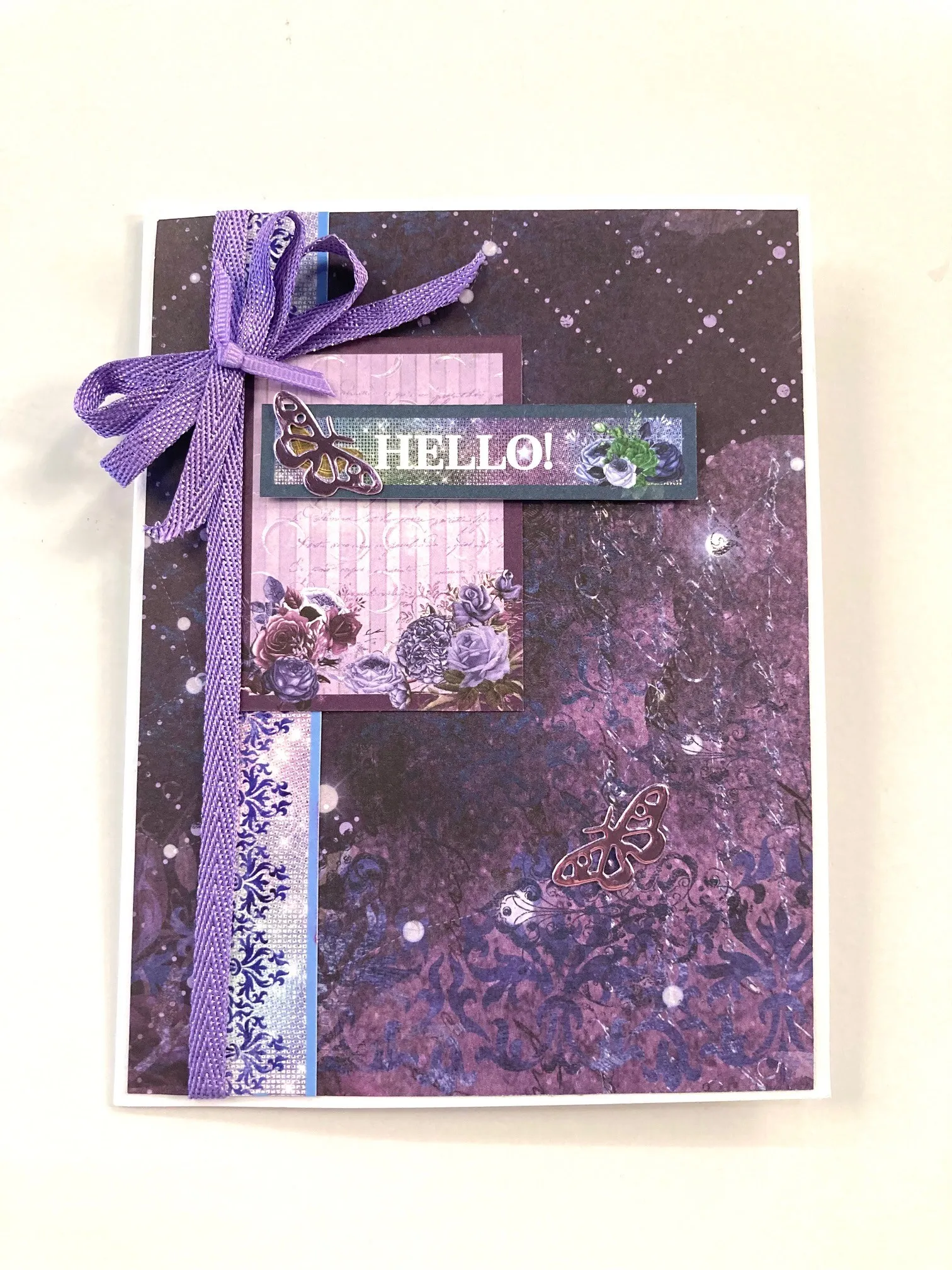 1. For the card front: Place the card with the fold on the left. Cut 4¾"x6¼" Mystic Moon purple corner design cardstock. Cut the blue border die-cut to 6¼" and glue it to the purple cardstock, ½" from the left edge. Wrap lavender shimmer ribbon along the left edge of the border, gluing the ends to the back. Glue the cardstock centered on the card front.