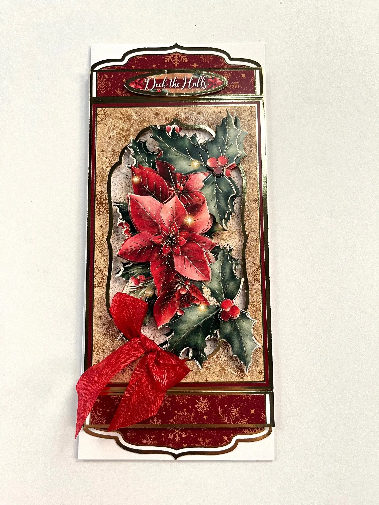 6. Inside: glue the card center and glue the banner at the bottom with a holly sprays at each end.