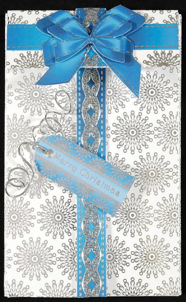 Mat the reserved Snowman image on Cobalt Holographic Ripple with 1/8” borders. Add Silver Jewel Border Dazzles™ to the bottom edge of the image. Tape the matted image centered on the top folded flap, so it extends over the front of the box. Foam tape the large bow die-cut and tag to the upper left corner of the matted image. Tape the small bow die-cut centered on the larger bow.