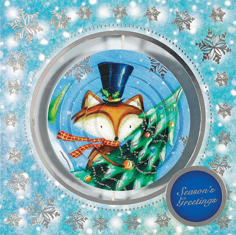 Use foam tape between pyramage layers of the Hunkydory Festive Spinners Christmas Fun. Put 1/2” Ultra Clear Tape on the back of the Fox & Animals pyramage. Lay a 4 1/2” Sparkle Silver Twine Cording down the center of the tape. Put another layer of tape over the twine. Tape the two pyramages together.