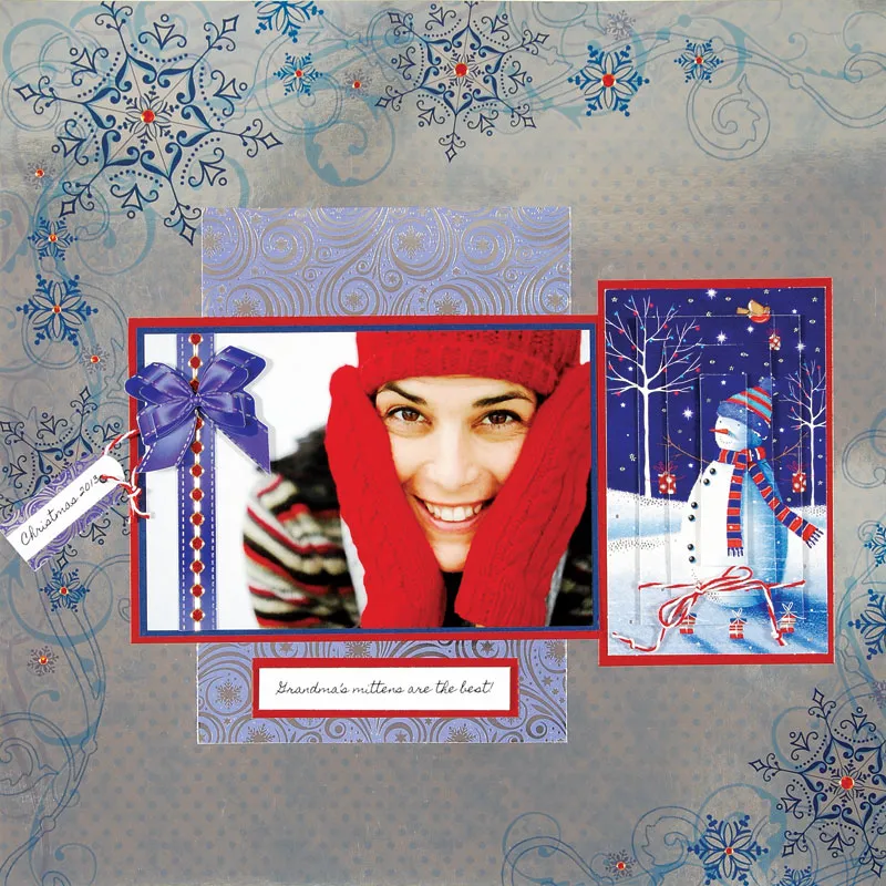Mat the photo with navy and red cardstocks, leaving 1/8” borders. Glue photo 1 3/4” from the left and 3 1/4” from page bottom with Hunkydory The Gifts of Christmas “A Snowman’s Christmas” lavender swirl door flaps glued to page, above and below the photo as shown.