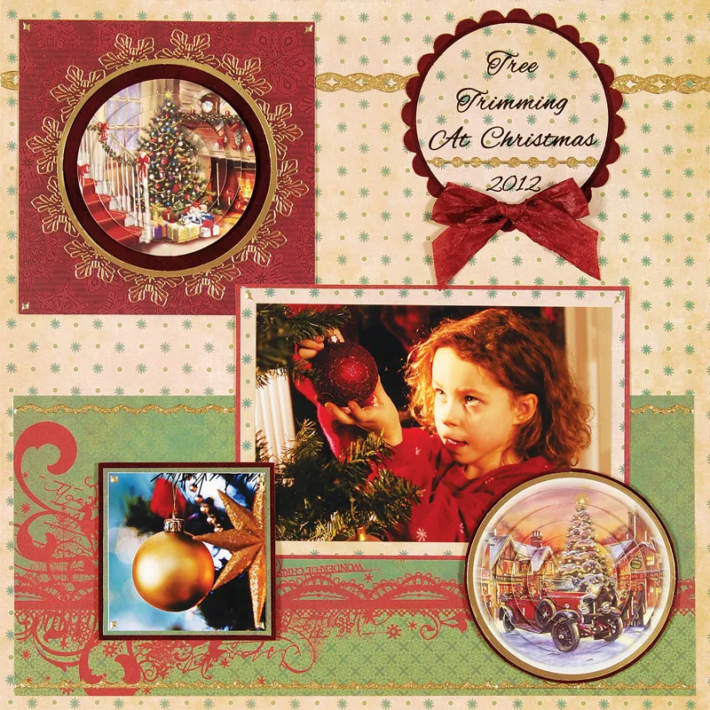 Journal “Tree Trimming At Christmas” and the year on Vintage Christmas tan/teal stars paper and use the large circle cutting die to cut out around the journaling. Create a large scallop die-cut from suede, glue the journaling over it and glue in place, as shown. Place Border Dazzles™ as shown. Zot™ on a bow of burgundy crepe.