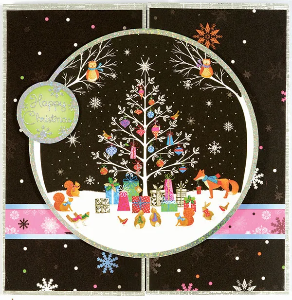 Cut two pieces of 2¾”x5¾” black snowflake/pink border cardstock and glue to each card flap, with the pink border at the bottom as shown. Foam tape only the left side of the large Christmas Tree circle die-cut (from the Woodland Christmas die-cut sheet) to the left card flap. Foam tape the green “Happy Christmas” die-cut circle to the left side of the large circle as shown.