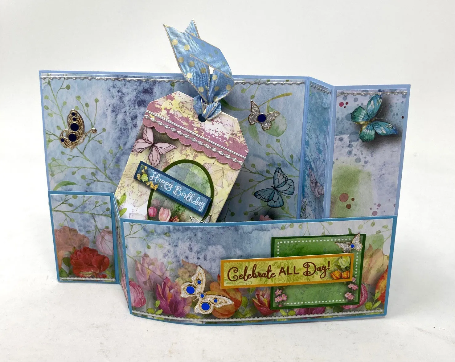 4. Tie 6" of light blue dotted ribbon to the pop-up and trim the ends. Glue the Tulips & Butterflies green oval cutout and foam tape the “happy birthday” cut out on the pop-up as shown. Place two silver thin line Dazzles™ near the scalloped edge, trimming the excess. Follow the die package directions to assemble the card with the sticky tape.