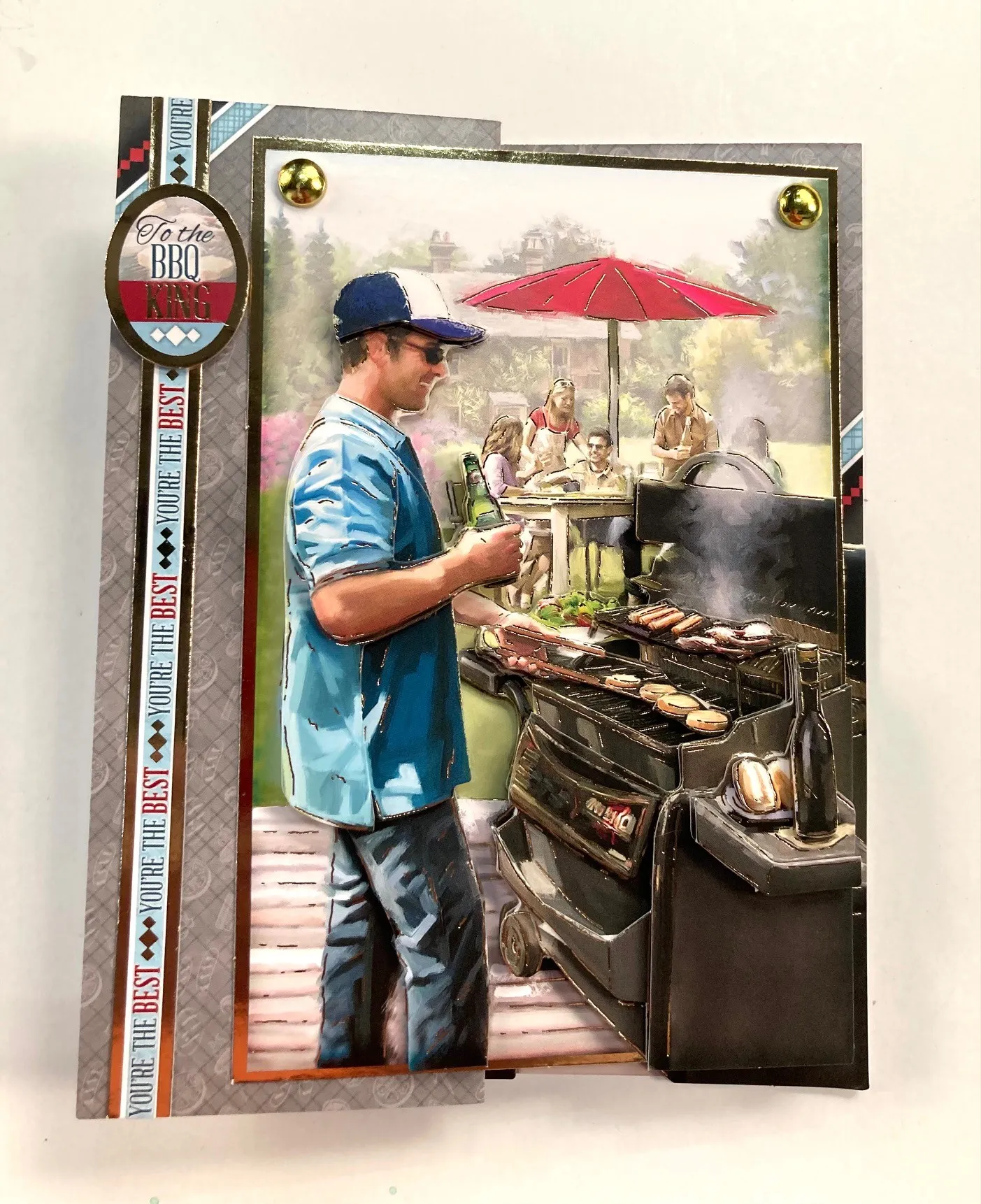 Card front: Attach the “base layer” using extra sticky tape onto the folded card front 1" from the left side. Tape the border 1/4" from the left. Foam tape "To The BBQ King" Topper 1/2" from the top along the border. Place a gold stud Diamond Sparkles in each top corner of the base layer. Foam tape the deco-large layers to the base layer but save the second largest piece for the inside.