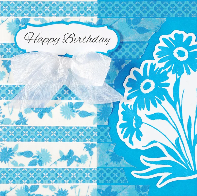 Place strips of the blue washi tapes across the card horizontally, tearing the ends before they reaching the flower image. Alternate the two designs of washi tape as shown. Trim the left edge even with the card.
