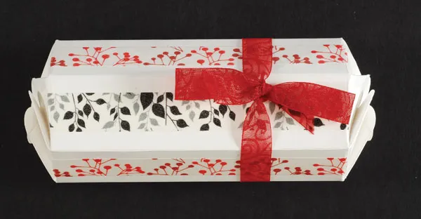 Assemble the box according to package instructions. Center lengths of Washi tape on each flat side of the box, alternating colors. Trim the tape ends even with the box ends. Wrap am 18” length of 1/2” wide red organdy swirl ribbon around the left side of the box and tie a bow.