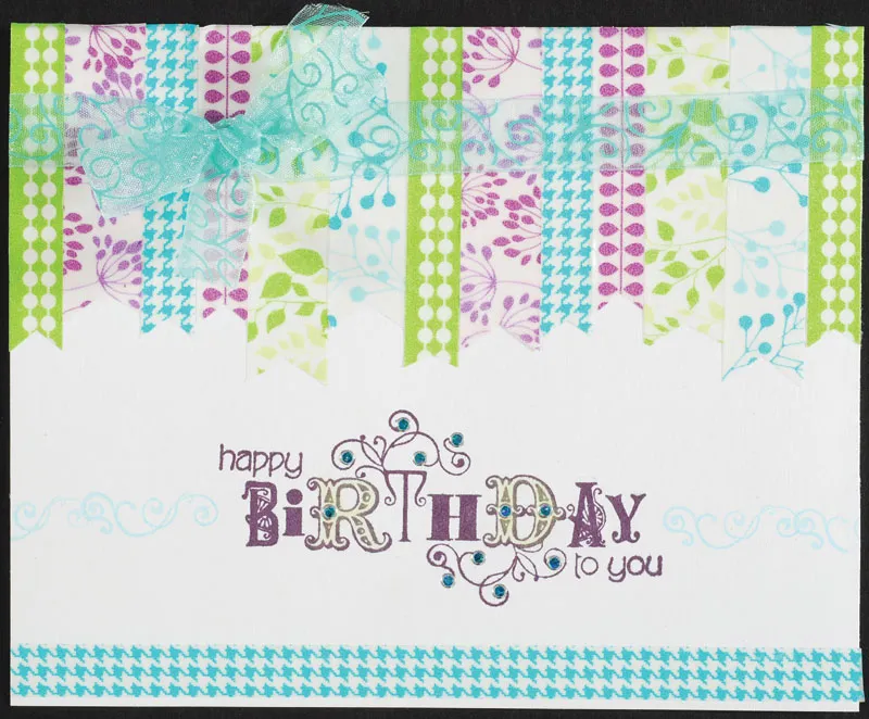 Stamp the “Happy Birthday” greeting using the Blackberry inkpad. Stamp a swirly border on each side of the greeting using the Sea Crystal ink. Wrap a length of aqua organdy ribbon around the card front and tie a bow at the top left side. Glue Dot the bow in place.