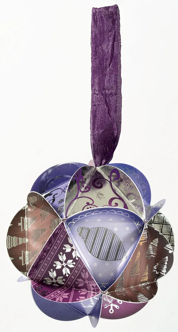 To make a small-sized bauble, punch out 20 small die-cut circles. Make sure to mix and match the circle colors. Knot the ends of a 9” length of purple crepe ribbon. Create the top of the bauble by folding on the scored lines and gluing the top 2 folded flaps of 5 circles together around the knotted ribbon, to form a cap shape with a loop extending from the top. Create the base of the bauble in the same way, without the ribbon.