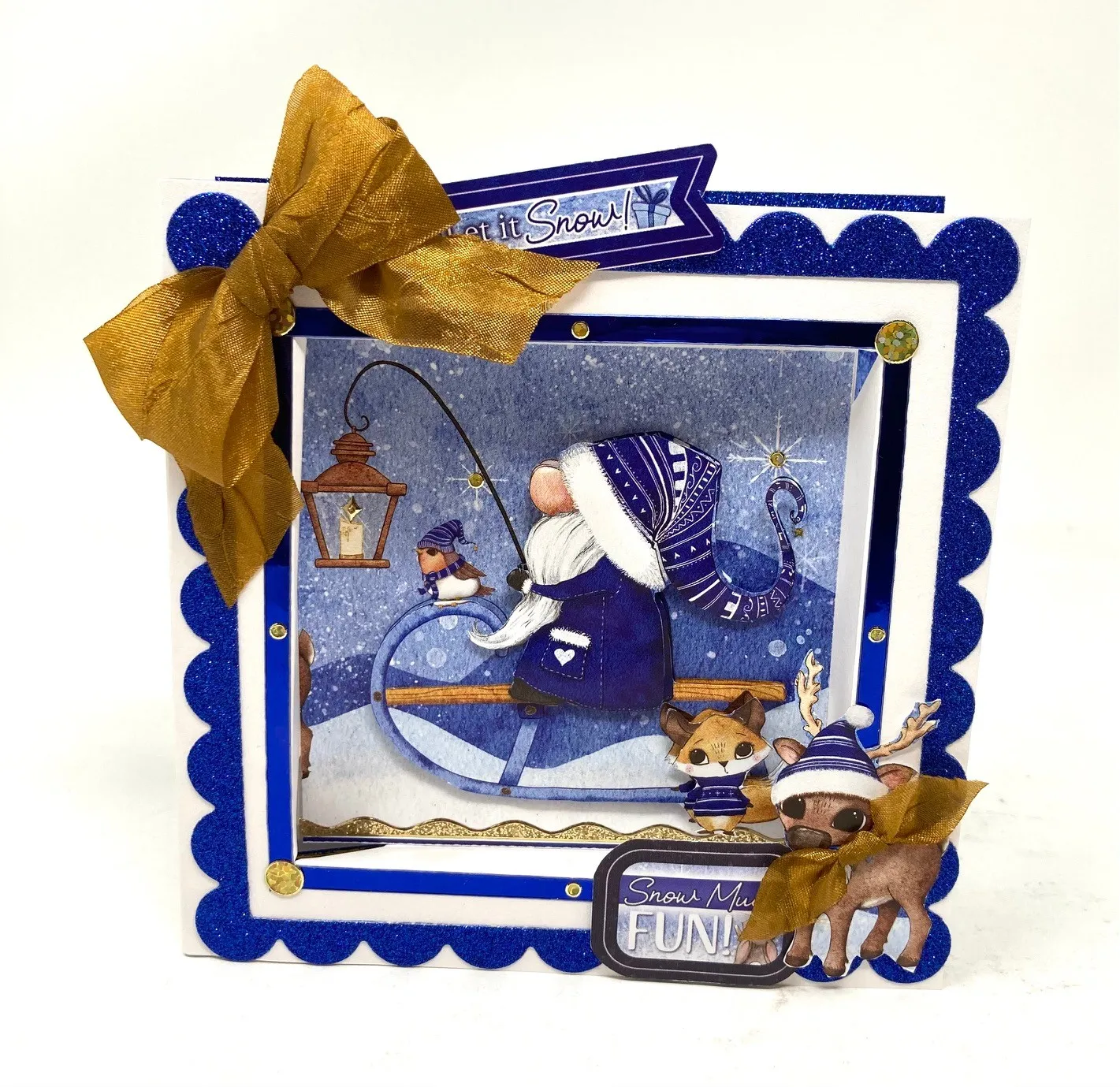 Use the blank square in the 3D Frame pack to trace the blue gnome paper and glue it to the square and glue into the frame area. Cut out one more area from the same sheets to foam tape layering the gnome and small critter. Place tiny gold Jewel Dazzles™️ as shown. Cut out the deer from the sheet and glue to bottom right frame. Cut small "Snow Much Fun" tag from the Little Book and tuck into the left of the deer. Zot™️ a small gold knotted ribbon on the deer.