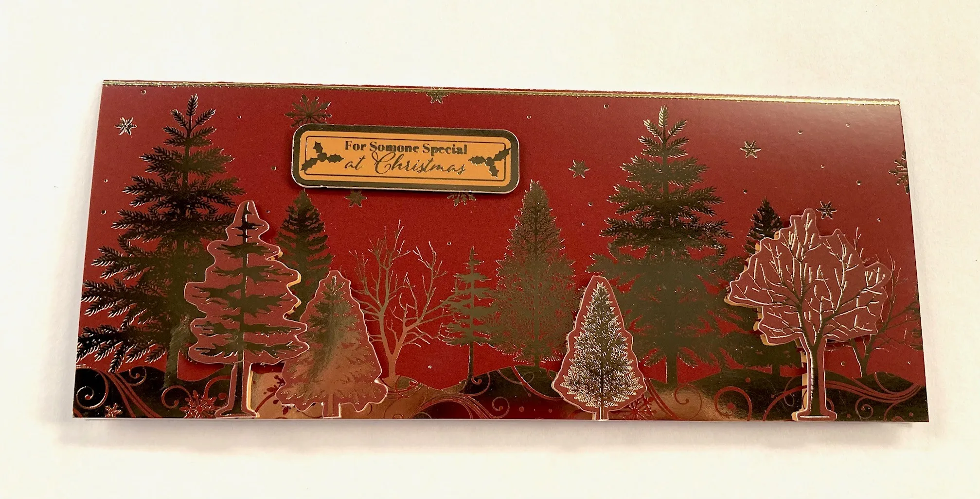 1. For the card & front: Cut 8½"x7" Christmas Elegance maroon trees cardstock and score it on the 7" side at 3½". Crease the score in a mountain fold to create the slim line card. Place the card with the fold at the top, then place a gold thin line Dazzles™ near the upper folded edge, trimming the excess.