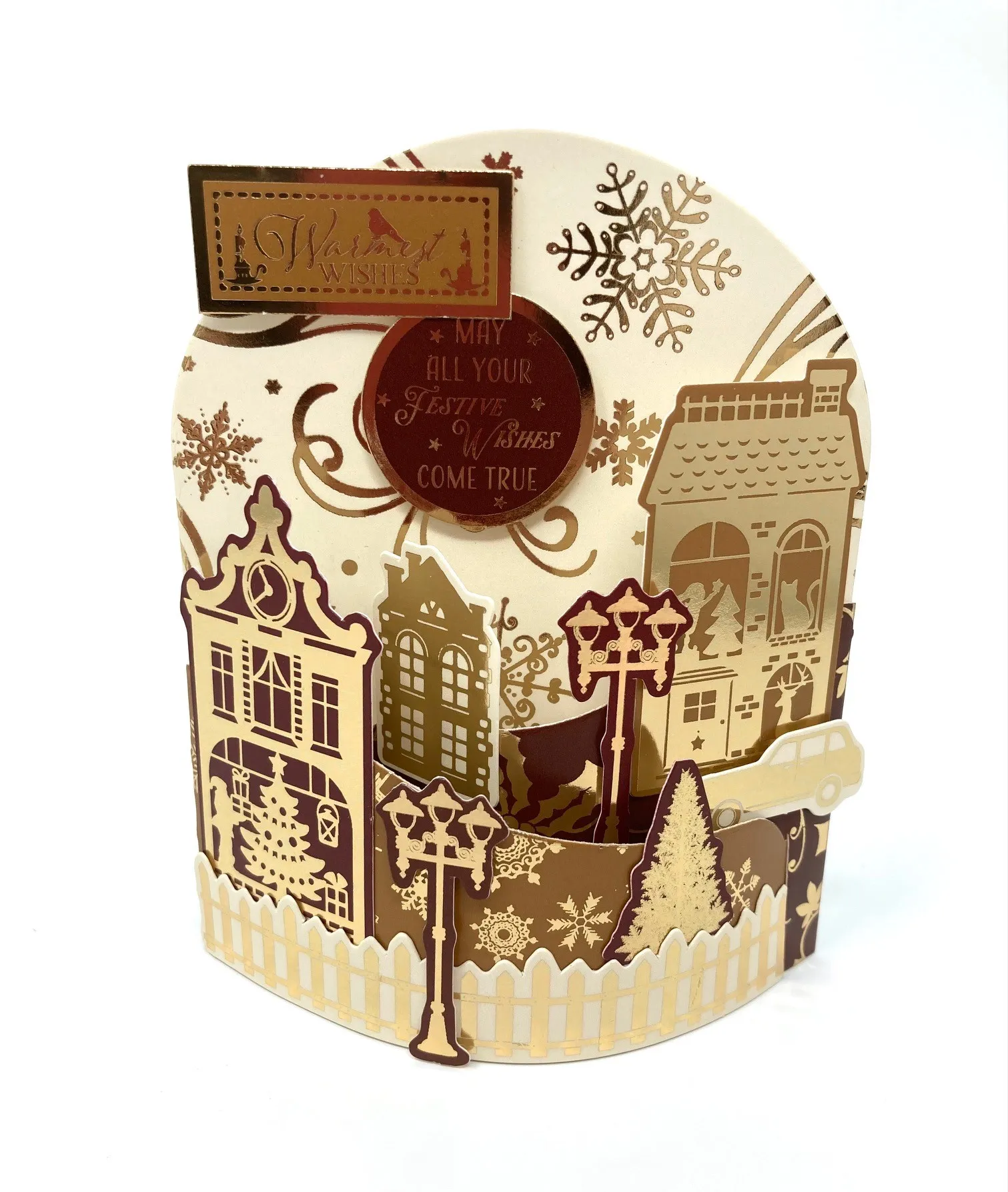 4. For the arched base layer: Close the middle and front layers. Foam tape the caramel “warmest wishes” and the brown “may all your festive wishes come true” die-cuts to the base so they show above the middle and front card layers.
