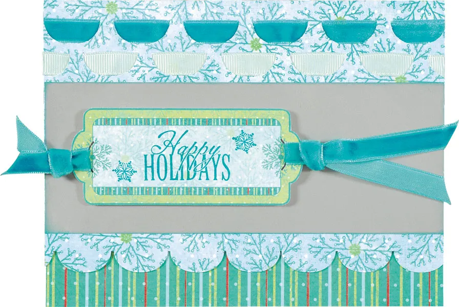 Glue 6 1/2”x2 1/2” of silver metallic paper across the front flap, 1/8” below the ribbon border. Stamp “Happy Holidays” in the center of the rectangle label from the Winter Delights free download. Stamp a couple small snowflakes on the sides. Place one end of the label in the Sew Ribbon template and punch a single slot. Do the same for the other end of the label. String 8” of velvet ribbon through the right slot and tie in a knot. String 4” of velvet ribbon through the left slot and tie in a knot. Foam tape the label to the card 1/2” from the left and 1 3/8” from the top. Trim the ends of the ribbon at an angle slightly longer than the card and Zot down the ends.