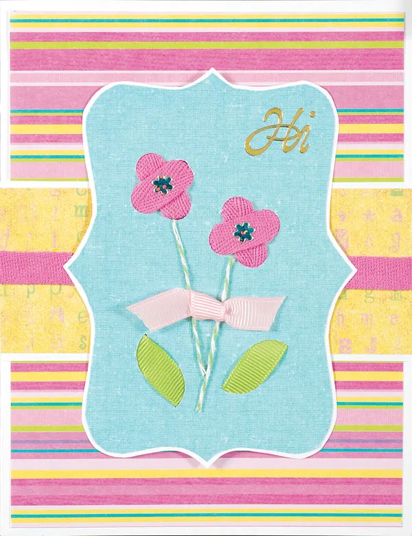 Punch 2 flowers staggered from 1-1 1/2” above the leaves. Thread pink twill ribbon according to the packaging instructions, trim the ribbon ends and tape to secure. Cut 2” lengths of baker’s twine and apply glue stick to one side. Place as stems below the flowers. Knot a pink grosgrain ribbon and trim tails to 1/2” long. Glue over the stems. Place blue flower Jewel Dazzles™ to the pink flower centers and “Hi” Dazzles™ at the top right corner. Glue pink twill ribbon to the yellow border and foam tape the label bracket to the card center.