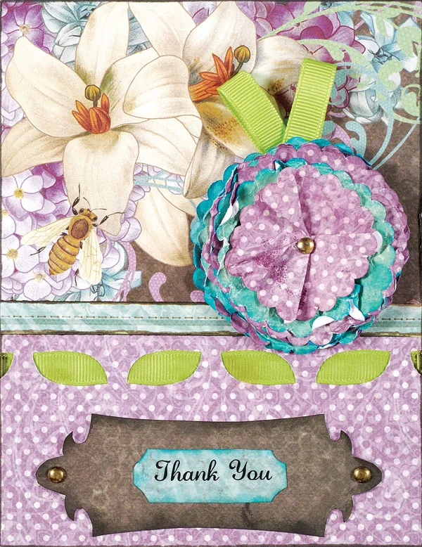 With the fold on the left, cover the top 3 ¾” of the card with Enchanted Moments brown corner flower paper. Cut Enchanted Moments purple polka dot paper to 5”x2 ¾”. Using the Sew Ribbon Leaf Template, snap the stencil top and bottom together with the Enchanted Moments purple polka dot paper sandwiched in between. Reposition ¼” from the top edge of the paper, centering your stencil to insure your ribbon will look even on the card. Using the tool provided, punch through the stencil slits until you hear and feel the tool handle hitting the top stencil. You will feel the blade punching through your paper, but the blade will not go through the bottom stencil completely. Bend the ribbon needle in half and peel the backing away starting in the middle. Adhere to the green Sew Ribbon half way to the folding point (do not cut your ribbon to length as this will be easy to do once the ribbon is strung through the paper). Making sure your ribbon is straight, simply weave the ribbon in and out of the slots to create the ribbon stitch. Once completed cut the ends to match the edge of the paper and glue to the bottom of the card. Using the Enchanted Moments striped paper, cut a blue strip, ink the edges brown, and glue on top of the flower and polka dot paper seam. Ink the edges of the card brown.