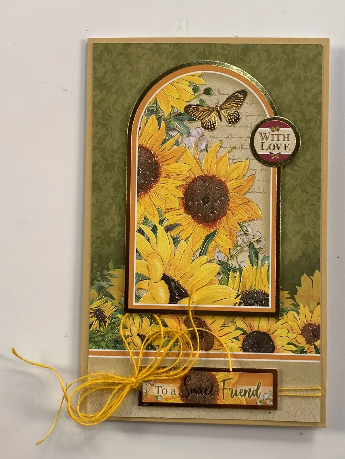 Punch out the Sunflower die-cuts shown and foam tape all three in place. Make a 6-loop bow with yellow jute and tie the center with a 4" yellow jute strand. Glue the bow as shown.