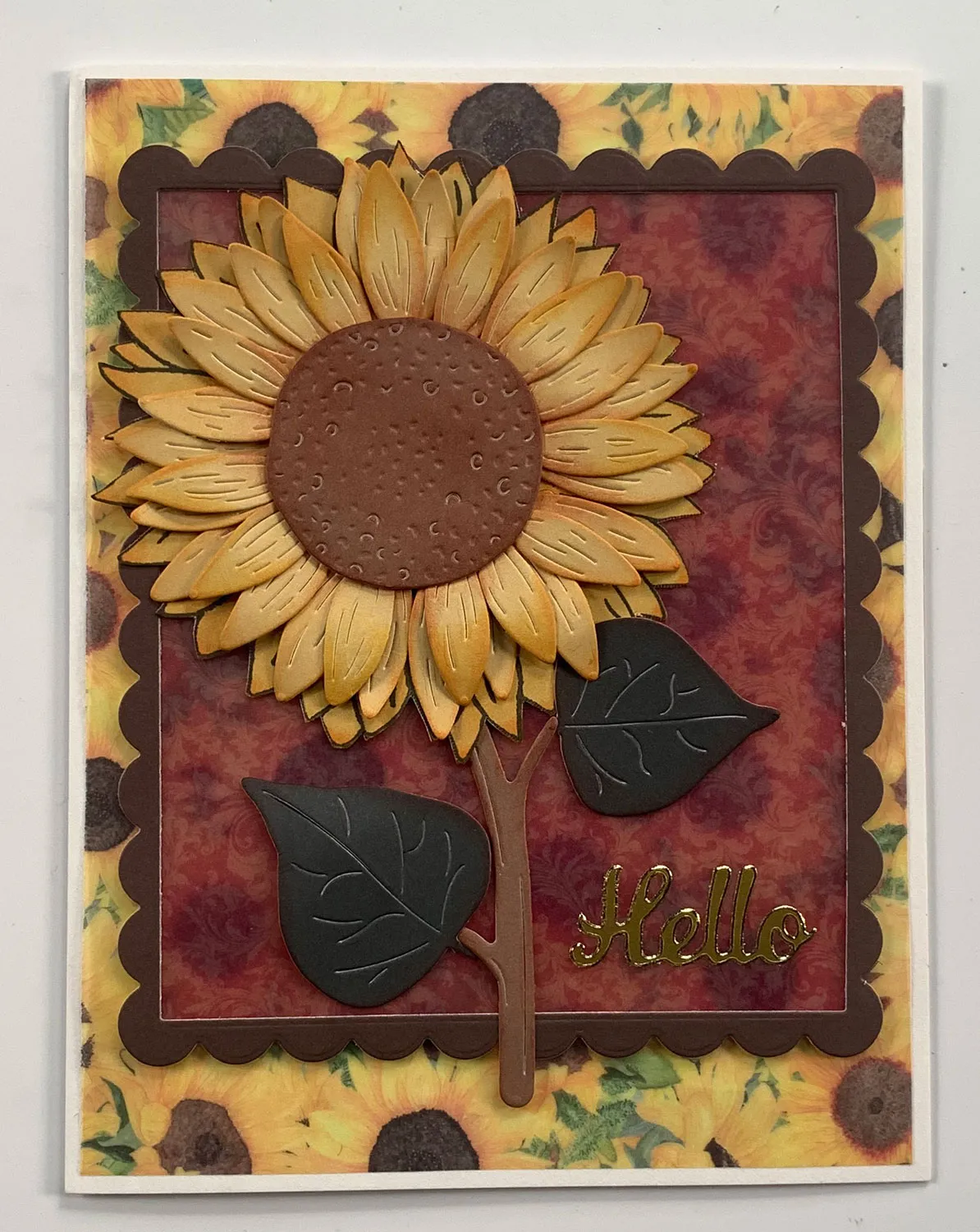 For the card front: Place the card with the fold on the left. Cut 4¾"x6¼" Sunflower sunflowers parchment and use tape behind the darkest and areas and the flower centers to attach it to the front. Die cut a frame from dark brown cardstock, using the 4"x4¾" rectangle inside the 4 3/8"x5¼" scalloped rectangle. Cut 4 1/8"x5" Sunflower maroon parchment and glue it to the frame back.