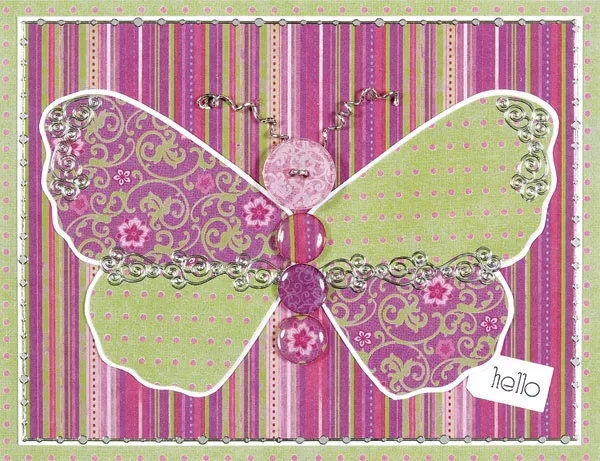 Write or computer print “hello” on white cardstock, and trim to a 7/8”x½” rectangle. Trim the corners for a tag shape and glue to the lower right of the butterfly. Place border Dazzles™ around the edges of the striped paper, piecing together at the sides as needed. Place the swirl border Dazzles™ on the wings, to decorate the butterfly as shown.