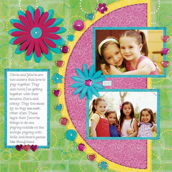 Mat the two 3”x4 ¾” photos on blue textured paper and glue staggered over the pink half-circle. Write or computer print journaling and year on white cardstock, trim, and mat on blue. Glue the journaling block to the left side of the page, 1 ¾” from the bottom. Glue the year between the photos. Layer large flowers and Zot™ to the upper left corner of the page. Zot™ a smaller flower near the photos.
