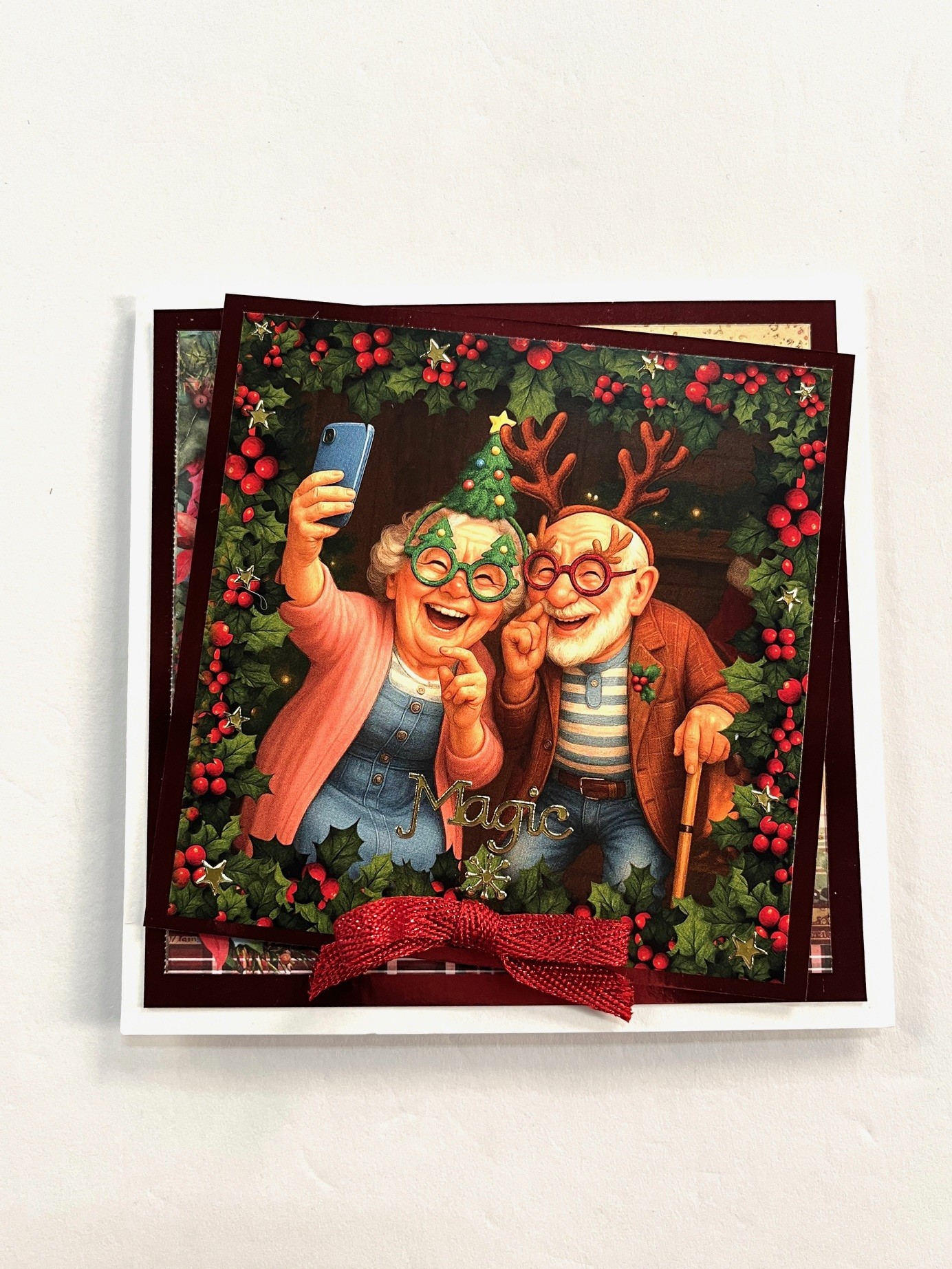 4 1/4” square and mat on red Mirri leaving 1/8” Mirri borders. Attach to the card front. Cut a 4” square of the couple from the paper pad and mat on red Mirri leaving a 1/8” Mirri border. Foam tape at an angle on the card. Place gold “Magic” Dazzles™️ 1” above bottom and stars in the greens. Make and Zot™️ a red glimmer bow from the Red Ribbon Set below the “Magic” Dazzles™️.