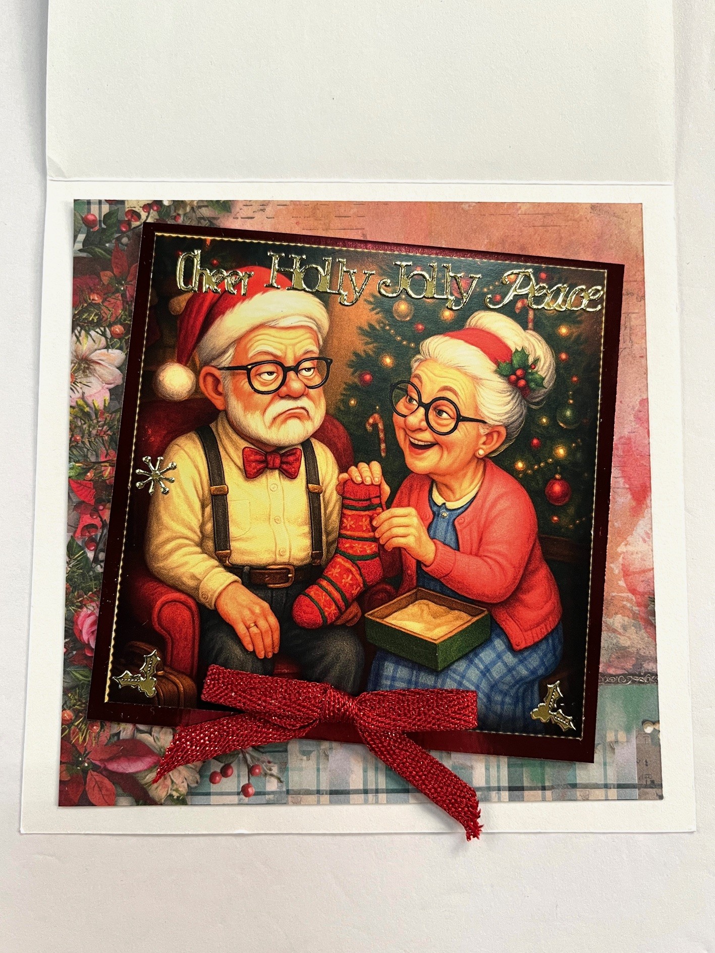 Card inside: Cut a 4 1/2” square of Christmas Plaid cardstock and tape to card leaving 1/4” white borders. Cut 3 1/2” square couple from the paper pad and mat on red Mirri leaving 1/8” Mirri border. Foam tape at an angle. Place Dazzles™️ as shown. Make and Zot™️ a red glimmer bow from the Red Ribbon Set and place centered at the bottom.