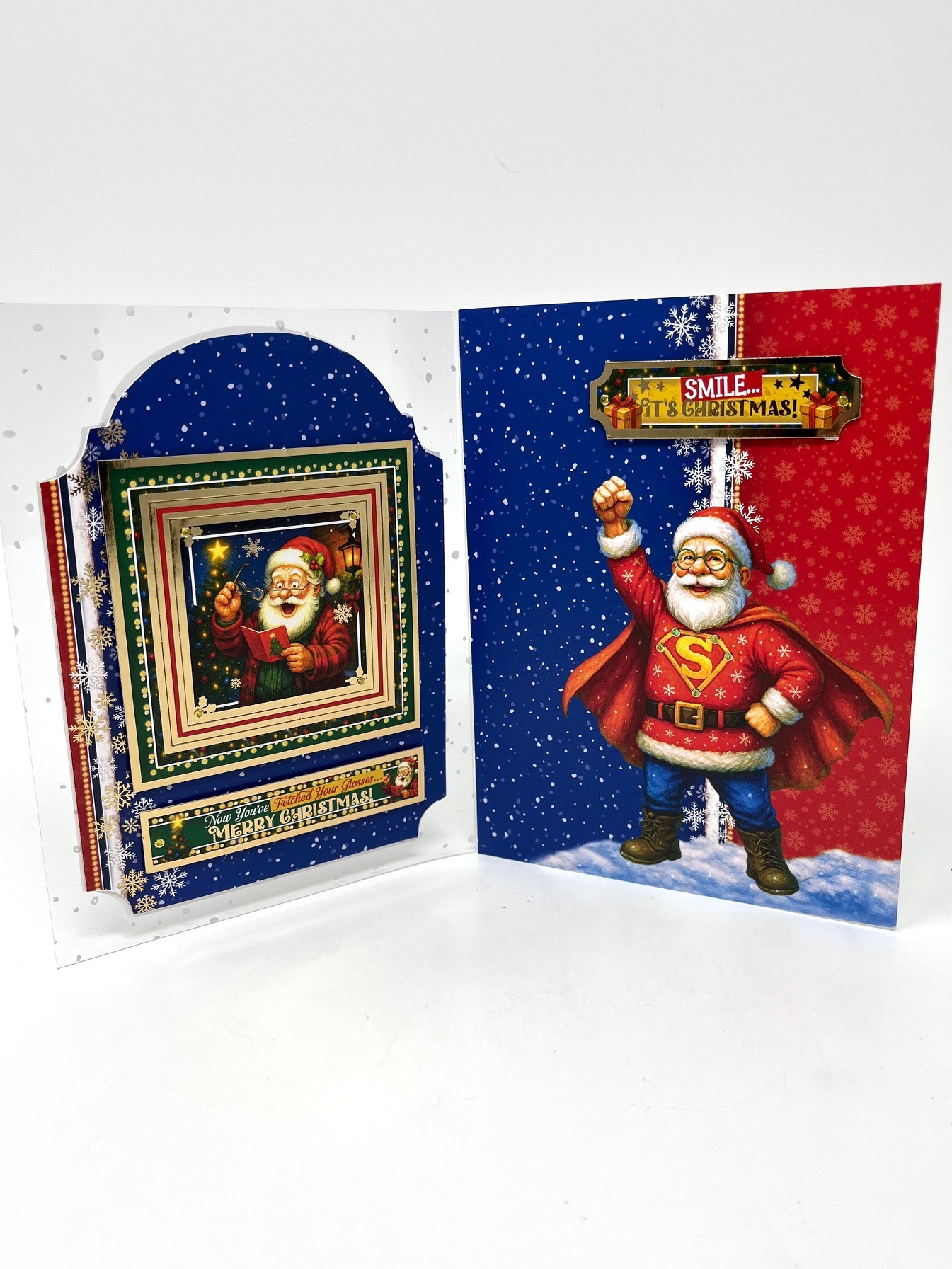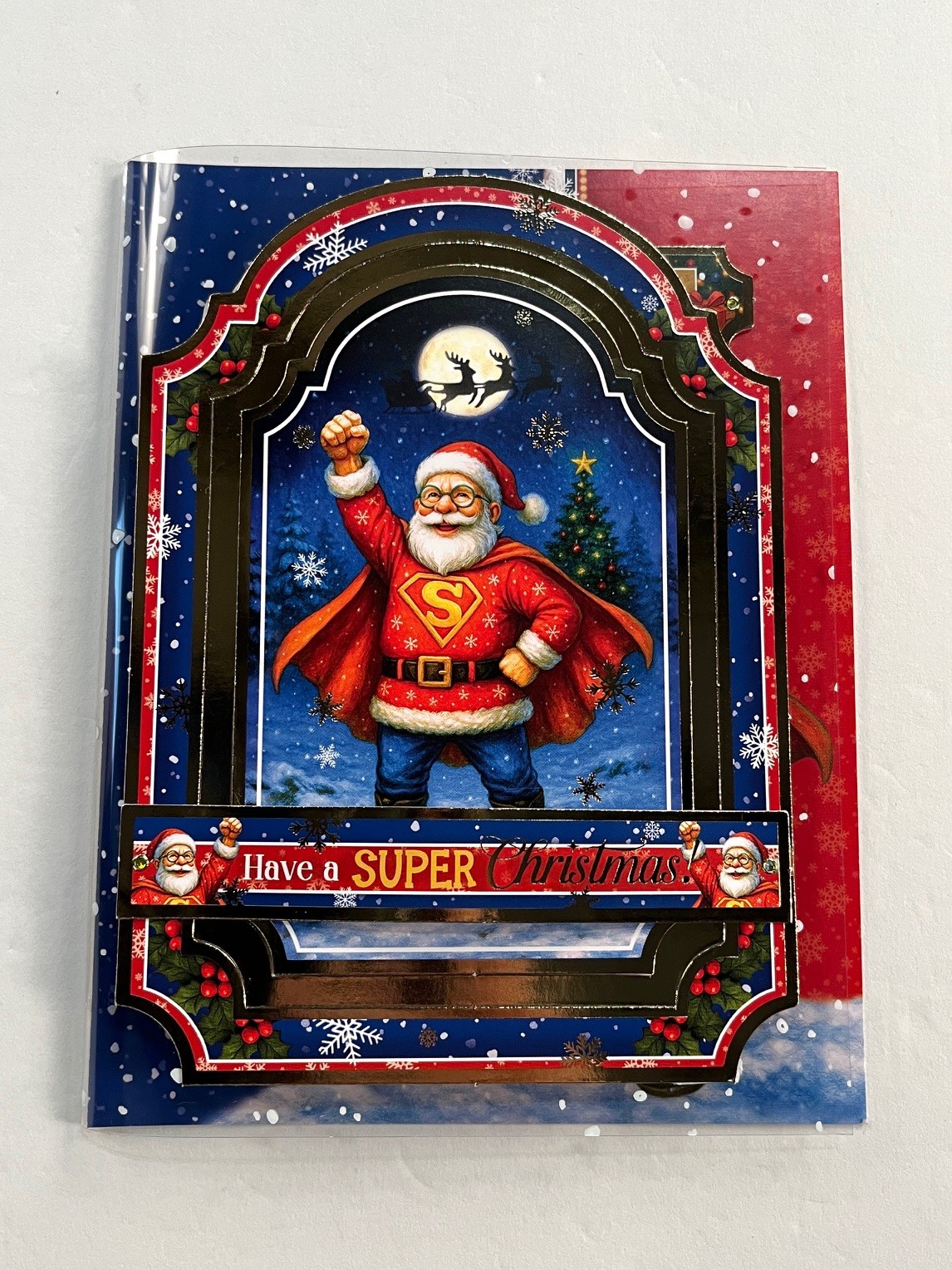 Remove the center of the Super Santa Topper and tape the rest of the Topper to the acetate front. Foam tape the Santa to the center. Place “Have a Super Christmas” 1 1/2” from the bottom and secure the ends with tape. Place foam tape in the center with gold Jewel Dazzles™️ at the ends.