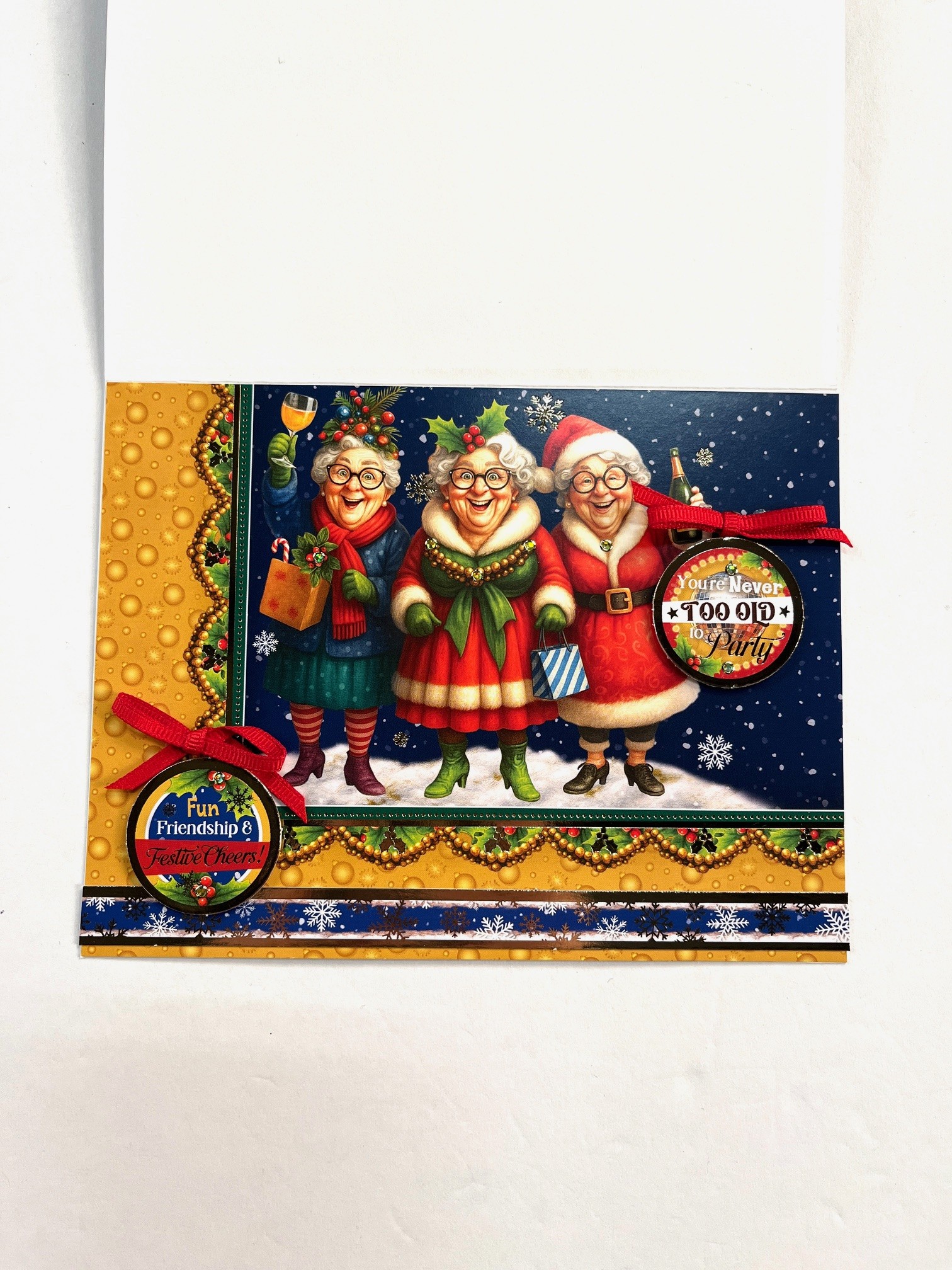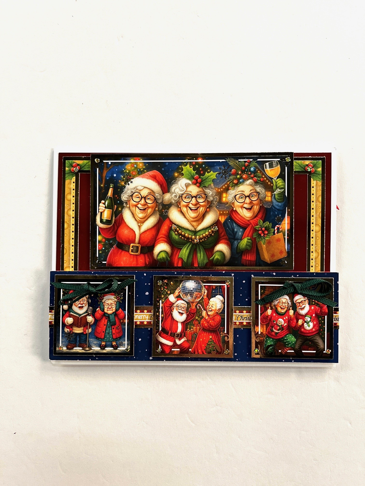 Cover the inside card with the three ladies foiled Adorable Scorable. Cut 6 1/2”x 2” blue snowflake strip from the remaining Adorable Scoreable and foam tape to the bottom of the card front. Tape the “Merry Christmas” border along the center. Foam tape three square images equally spaced along the border. Make and Zot™️ 1 1/2” wide green bow from the 1/8” Ribbon Set and place on first and last square. Place gold Dazzles™️ as shown.
