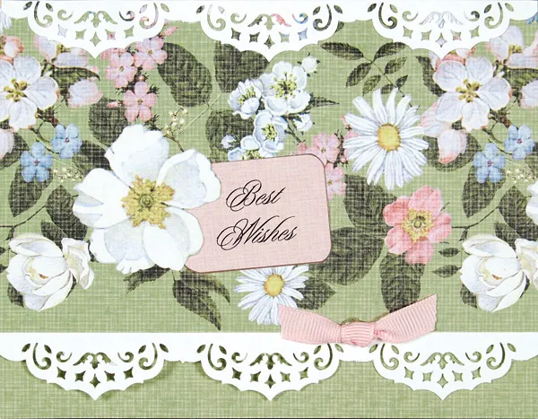 Turn the card so the fold is at the top and the punched border is at the bottom. Cut a 6 1/2" x 4" rectangle from the floral portion of the green/floral border paper, including a large white flower. Use your knife to cut around the edges of the petals on the right side of the flower. Write or computer print "Best Wishes" on the center of a pink tag and tuck it beneath the cut petals and glue in place. Glue the floral rectangle to the card front, even with the fold. Punch a duplicate border from white paper and glue centered over the floral paper, even with the fold of the card. Zot a knotted ribbon as shown.