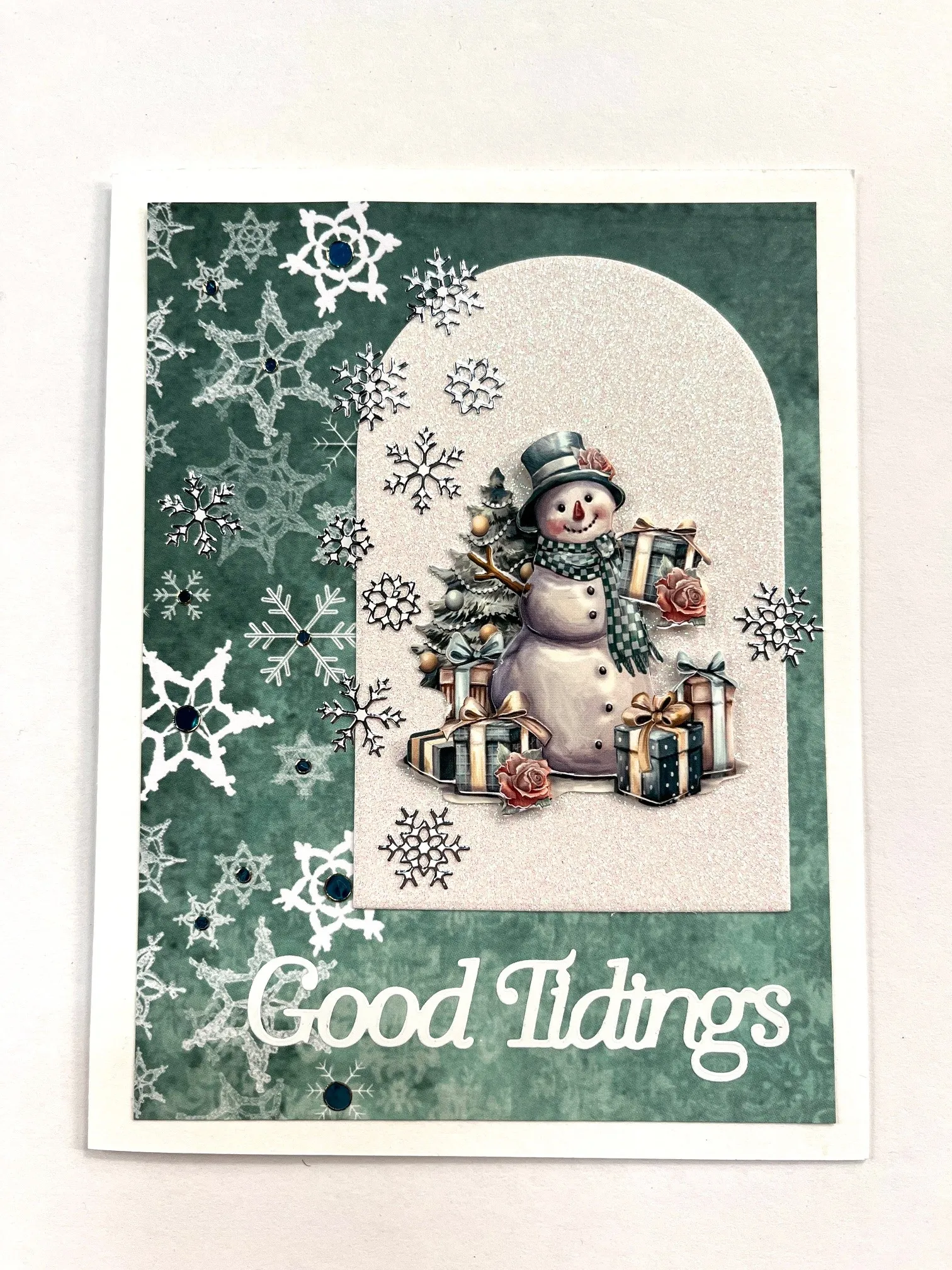 4. Place white “Good Tidings” from the Christmas Greetings pack along the bottom. Place silver small snowflake Dazzles™ around the white glitter. Place teal jewel Dazzles™ in the printed teal snowflakes. I used the pen knife to place all the Dazzles™, see the webisode.