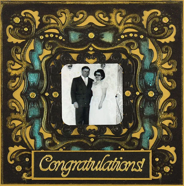 Cut a 6” square of black cardstock. Use the Christmas Present die to die cut the image. Carefully place the rubber mat over the paper, and run through again to emboss the image. Remove the inner label cut-out. Place the cutting die over the embossed image and use Perfect Medium™ to ink the bow sections on the cardstock. Remove the cutting die and brush Turquoise Perfect Pearls™ over the inked areas. Use the smaller brush to remove any excess Perfect Pearls™. Place the cutting die back over the embossed area and ink all the remaining embossing. Remove the die and brush Gold Perfect Pearls™ over all of the areas. Brush away the excess (you can also use an eraser to remove any stubborn gold areas). Spray a fine mist of water over the entire surface to set the Perfect Pearls™. Glue to the card center, and foam tape the inner label to the center. Use Corner Chompers to round the corners of a 2” square photo, and glue to the center. Place “Congratulations” Dazzles™ on a 3¾"x3/4” black cardstock, and mat on Hammered Gold paper with 1/16” borders. Foam tape to the bottom and embellish with Gold Jewel Dazzles™ as shown.
